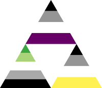 * A triforce é um símbolo dos jogos de zelda, um triângulo maior constituído por 3 triângulos mais pequenos, que simboliza uma grande fonte de poder e o equilíbrio entre 3 forças menores. Então, nesta imagem está uma triforce constituída pelas bandeiras da assexualidade (com roxo), arromanticidade (com verde) e aplatonicidade (com amarelo). Basicamente, uma pessoa que não sinta atração nenhuma detém o poder máximo xD