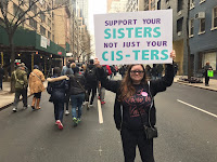 • A crítica era especificamente sobre a Woman's March. Woman's March. A Marcha da Mulher. Mulher. O que tem isso? Coisas como ter útero, menstruar, vagina - são parte da experiência só de algumas mulheres (e nem só mulher cis, porque tem mulher cis que também não se encaixa nesses ideais). Além disso, nós vivemos num mundo transfóbico/cissexista do caralho onde já parte do pressuposto de que essa é a experiência universal da mulher. Então quando você junta as duas coisas, existe, sim, um reforço de que a ideia de que só existe esse tipo de mulher e ele é o Verdadeiro™. Se fosse uma Marcha LGBT ou uma para "Mulher LGBT", que só fala de lésbica e reforça a vivência lésbica - eu não ia pensar duas vezes em apontar o apagamento da bissexualidade/pansexualidade. Ainda mais porque existe já a ideia de que bissexualidade não existe de verdade e ou você é hétero ou você é homossexual. Então, sim, se fazem uma Marcha da Mulher LGBT que ignoram a existência da mulheres bissexuais e cartazes que apenas afirmam ser lésbica como a única forma possível, eu ia criticar. Por que eu não criticaria isso da Woman's March? Por que eu não considero a vivência da mulher trans real o bastante como mulher? Provavelmente era isso que tava acontecendo.