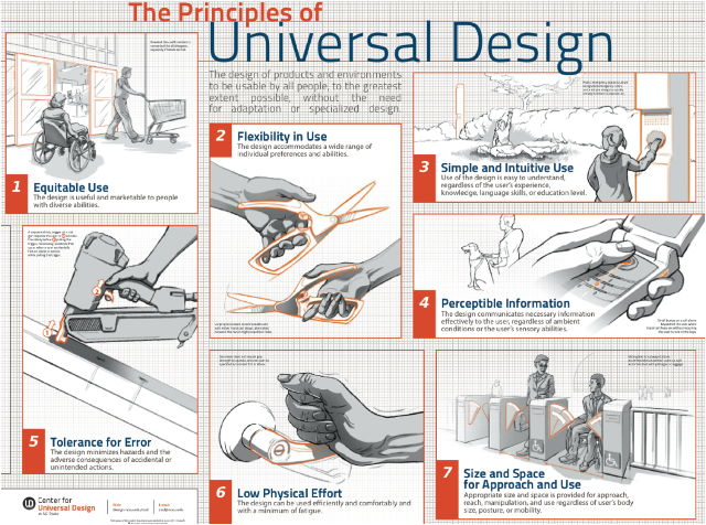 - 1) Uso equitativo: providendicar a toda a gente meios idênticos ou, quando impossível, equitativos, evitando a segregação.