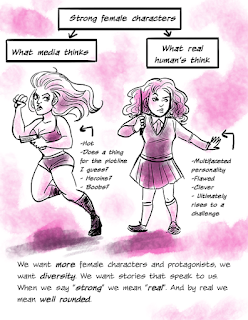 Na verdade, este post não pretende fornecer uma definição do que é uma personagem feminina forte, pois eu não acredito que hajam mulheres mais fortes que outras - e isso não se aplica só a mulheres obviamente. "Mulheres fortes" não passa de uma buzzword, de um conceito que se tornou popular por parecer que é uma forma de respeitar mulheres mas, no fundo, que só serve para as comparar, avaliar e categorizar, e a nossa sociedade já faz julgamentos que chegue na vida real para ter de transpor isso para as questões da representatividade. O meu ponto é que não quero alimentar a narrativa de que há uma forma correta de representar mulheres pois, como qualquer grupo, esse é muito diversificado e é um erro achar que há modelos de personagens femininas capazes de espelhar um grupo inteiro. Assim, eu ofereço uma alternativa: ter mais mulheres. Representatividade não é uma questão de qualidade. Representatividade é uma questão de diversidade. E que melhor maneira há de captar diversidade a não ser através da representação de muitas pessoas distintas?